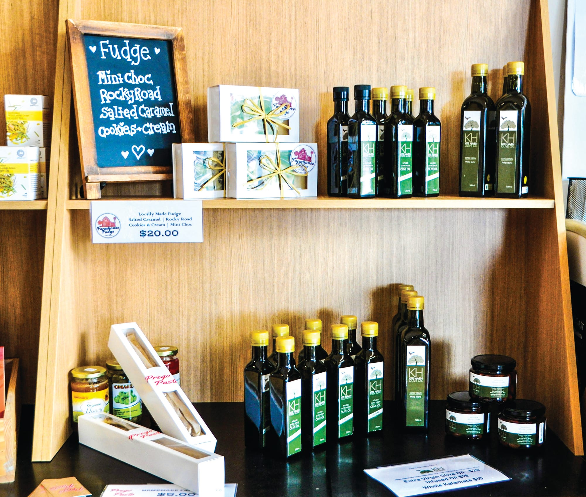 Purple Hen Wines. Green Gully Brewing Company, Phillip Island Wine Estates, French Island Vineyards, The Gurdies Winery, Phillip Island Honey, Bassine Specialty Cheeses, Farmhouse Fudge Company, Top Hill Farm Meats, Kitehaven Olive Oil, Phillip Island Brewing Company, a mix of teas, relish and jams from the Wild Food Farm, and pasta from Prego Pasta are all available.