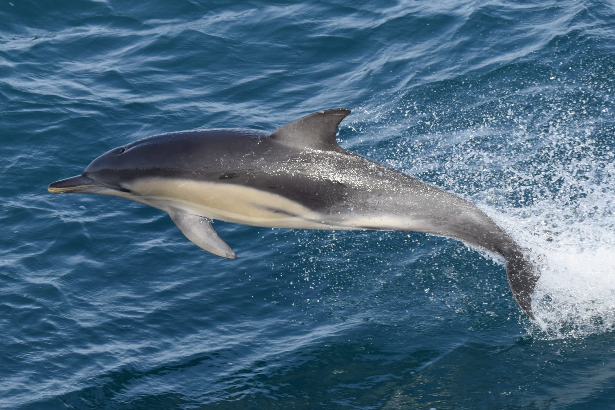 Common dolphins have a cream to light grey coloured hourglass shape on the sides of their bodies. This helps us differentiate them from bottlenose dolphins.