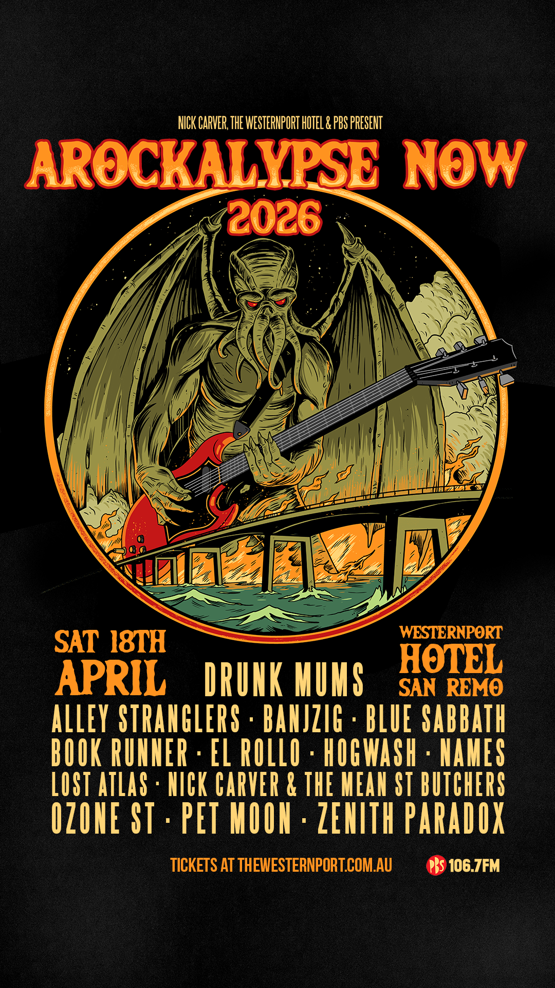 Featuring: Drunk Mums, Hogwash, Pet Moon, Zenith Paradox, El Rollo, Banjzig, Nick Carver & the Mean St Butchers, Names, Book Runner, Blue Sabbath, Alley Stranglers, Lost Atlas and OZONE ST.