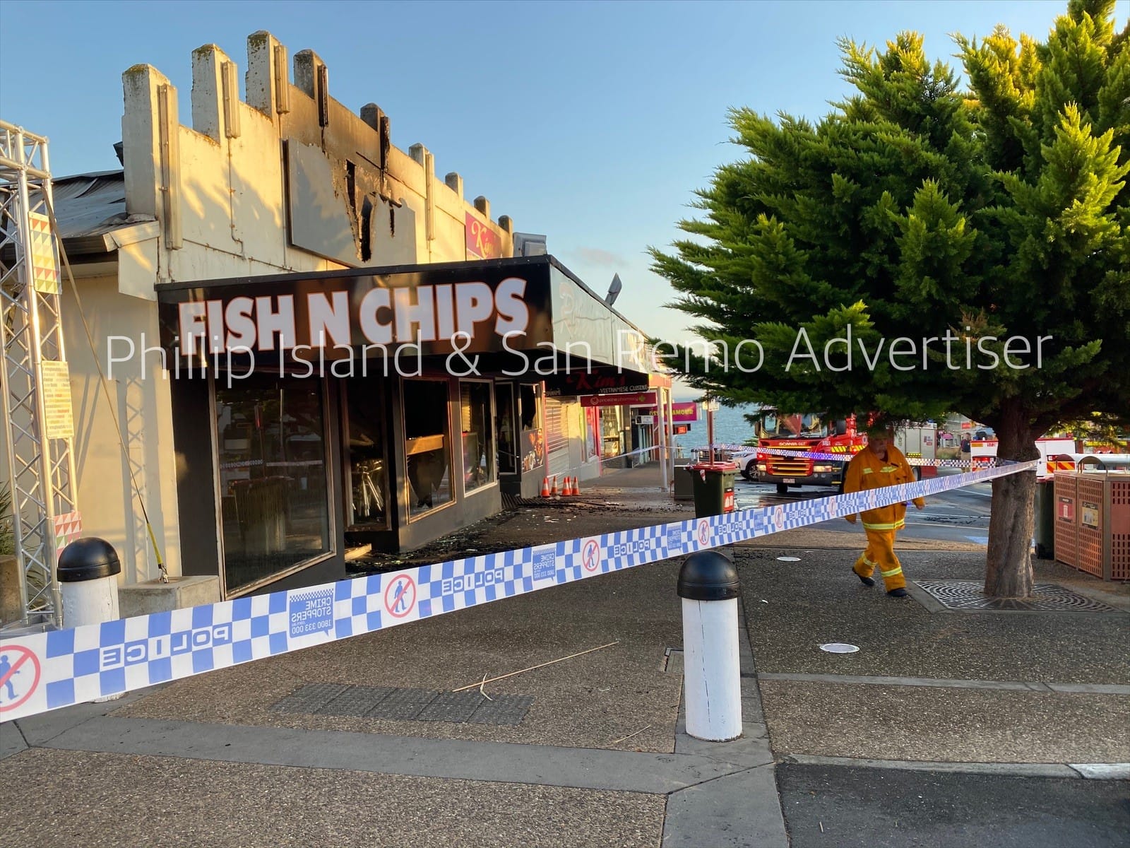 The blaze started in Kim's Bakehouse and spread to Riley's Fish n' Chips on Thompson Ave, between the Esplanade and Chapel St, about 2am.