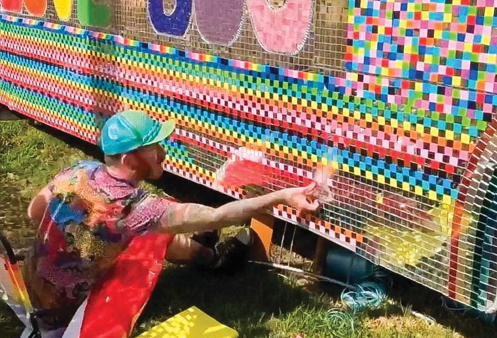 Mykey applied tiny colourful square vinyl wrap to the "love bus" and says he still has yet more work to complete the project.