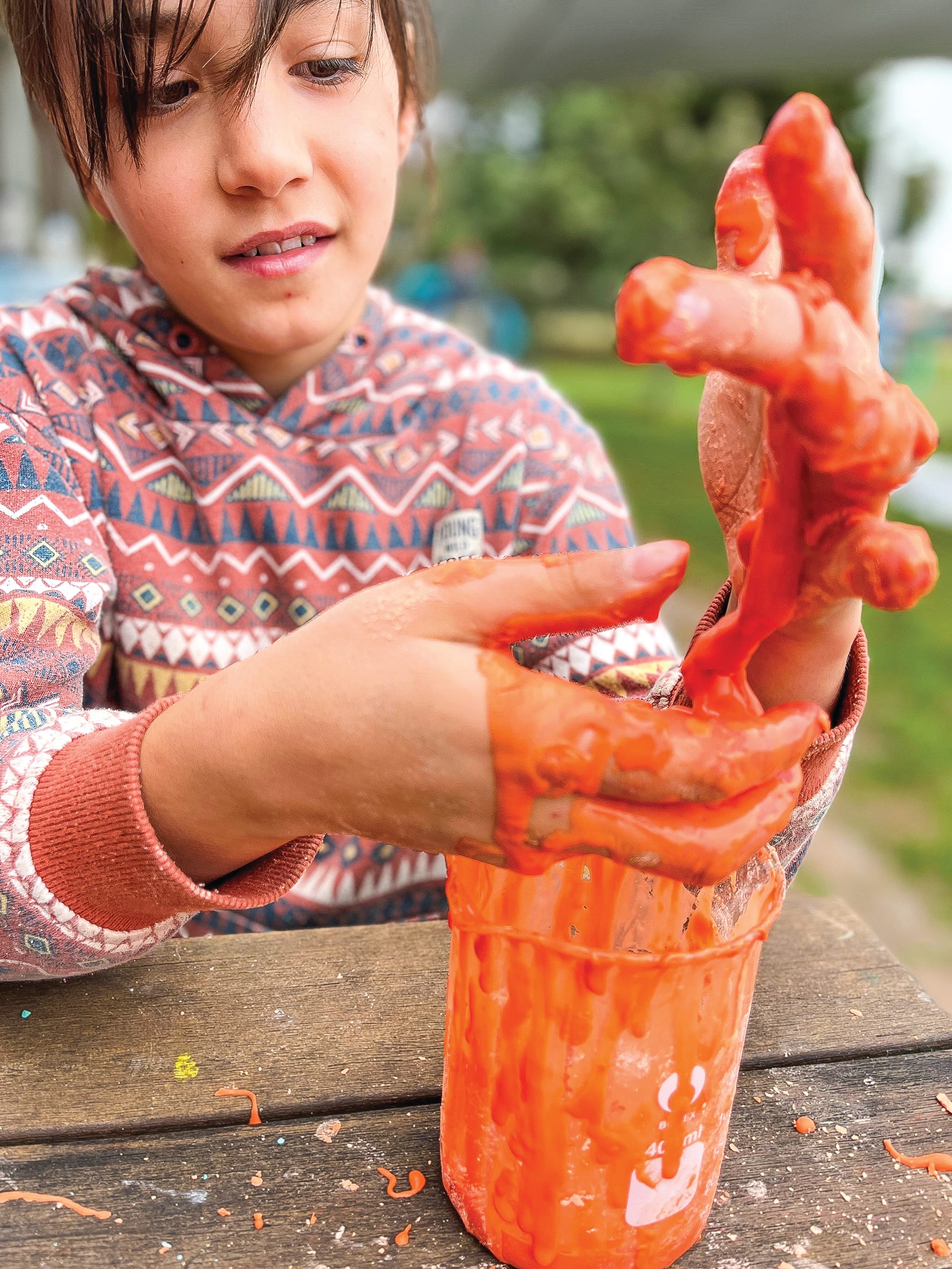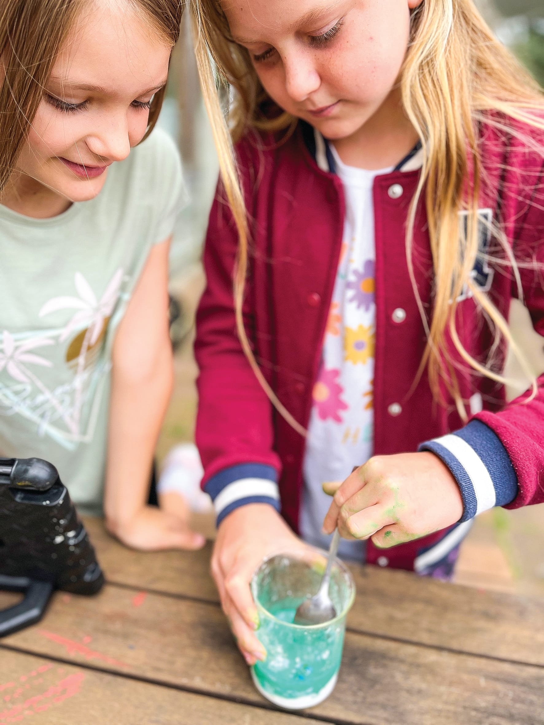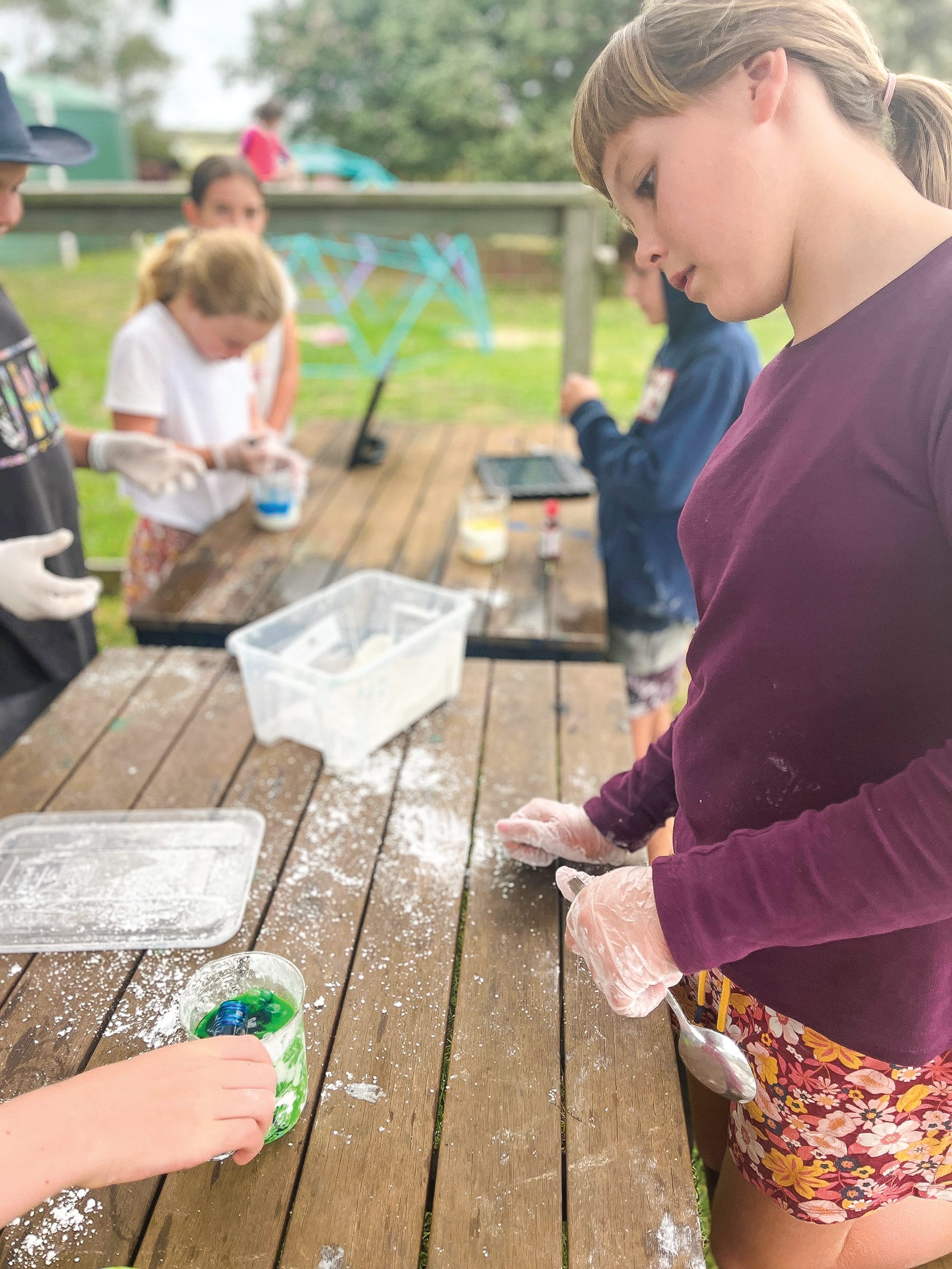 Students tested acids and bases, created exothermic reactions, learned about the properties of non-Newtonian fluids like slime (made in a few different ways), tested the way in which ingredient texture affects experimental outcomes, and explored chemical and physical changes in materials.