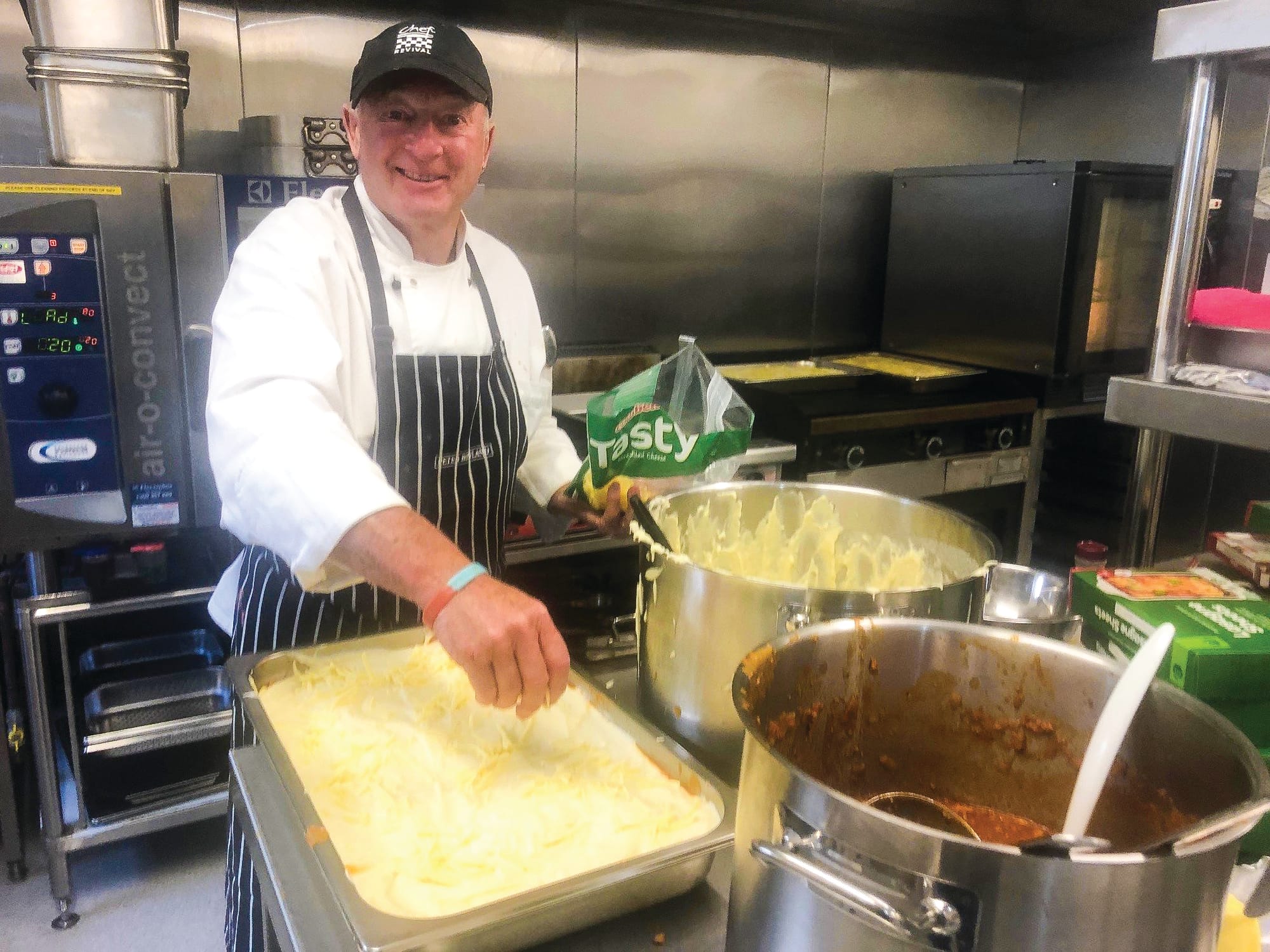 Meanwhile the commercial kitchen at the St Philips Anglican hall is bursting into life with the cooking team starting the meal preparation.