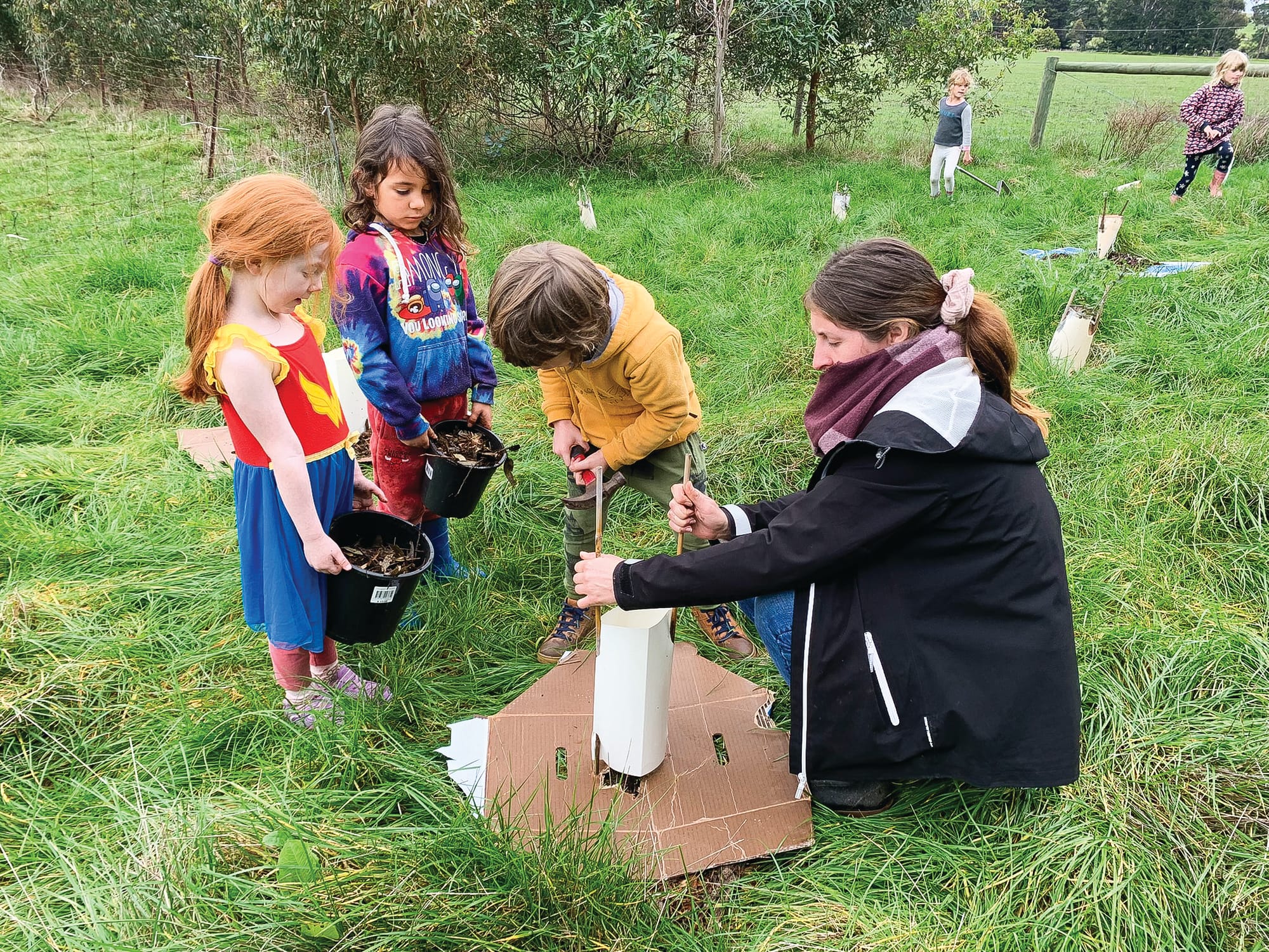 The school provides many opportunities for students to be outdoors, starting with regular “Bush School” sessions. There are weekly visits to the nearby Landcare property owned by David Rooks and family, where the Shooting Stars (early years) students have been involved in a wide range of farm and conservation tasks, from learning about soil to helping with farm animals. The whole student group is involved in all of these activities, and as the children get older and move into the Allstars (older years) they have more opportunities to choose the ways in which they express their connections with nature.