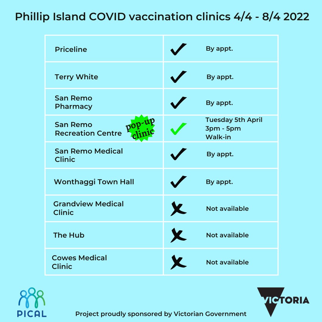 “We are now liaising with all local Phillip Island and San Remo GP clinics, chemists and walk-in hub providers of vaccinations and RATs on a daily basis in order to provide a central point where all this information is available,” the PICAL spokesperson said.