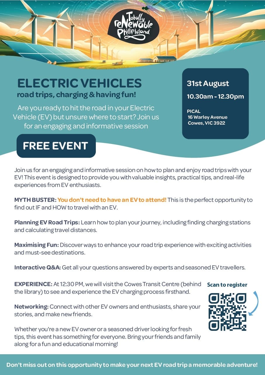 This event, presented by Totally Renewable Phillip Island (TRPI) is designed to provide you with valuable insights, practical tips, and real-life experiences from EV enthusiasts.
