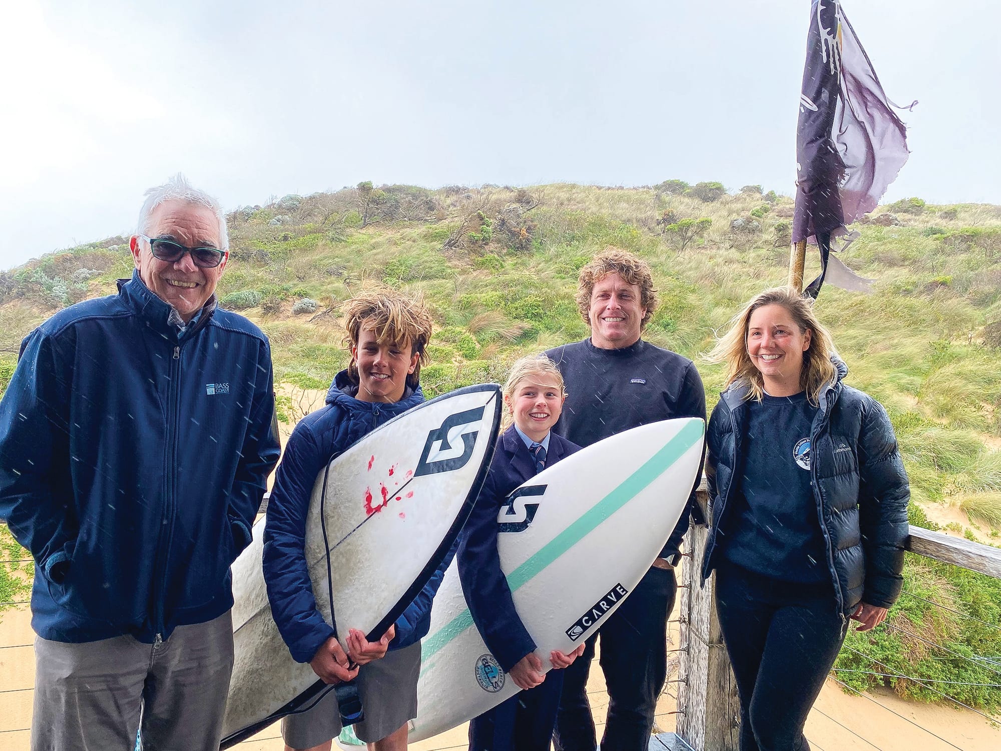 CEO of Surfing Victoria Adam Robertson, local junior surfers Angus Kennedy and Scarlett Rennie, Bass Coast Mayor Cr Michael Whelan and President of the Phillip Island Boardriders Club Hannah Eisen rugged up and faced the elements for the announcement.