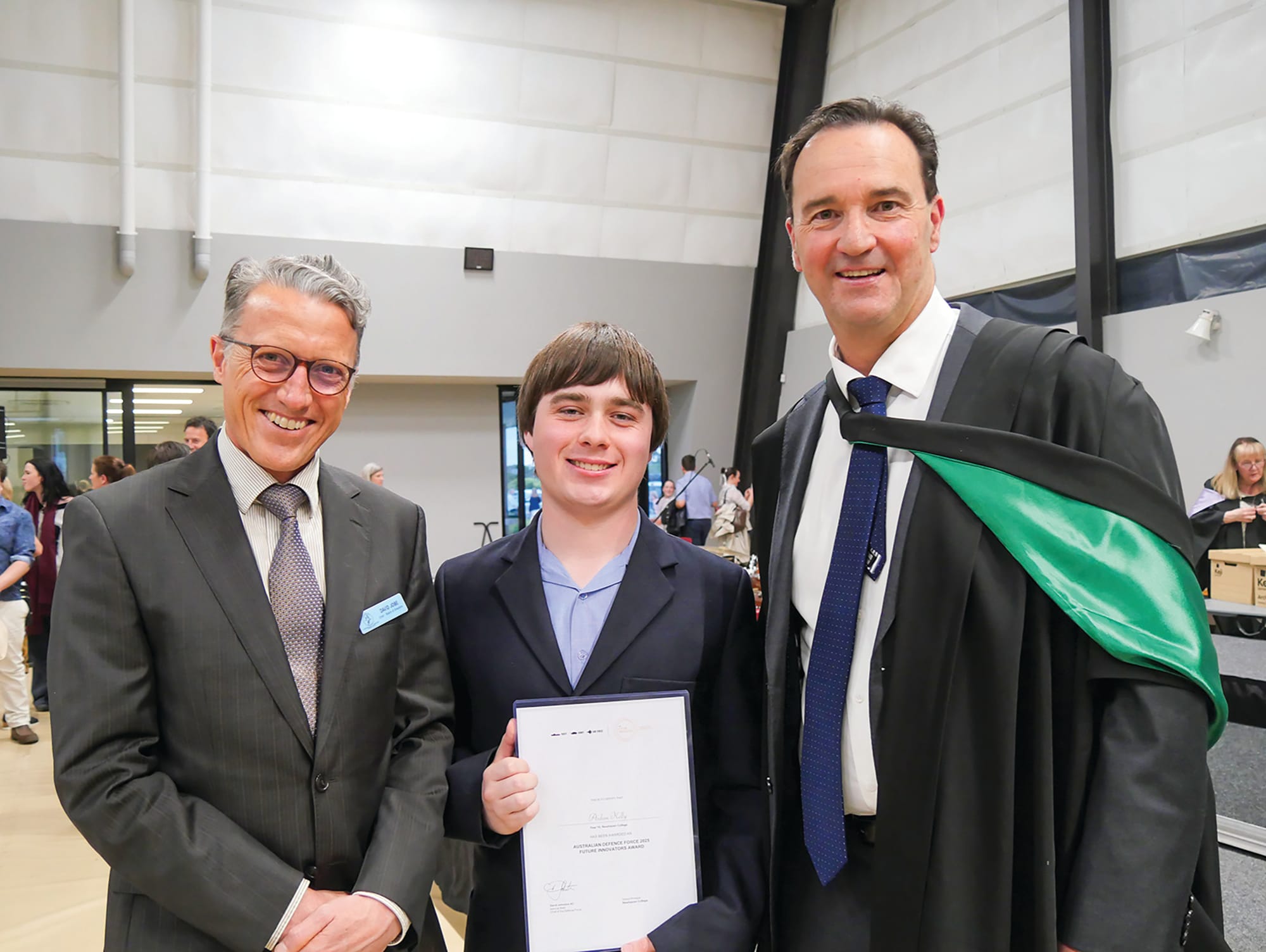 Newhaven College Year 10 student, Aidan Kelly, awarded the ADF Future Innovators Award and Dux of Year 10, with Chair of the Board David Jobe and Principal Tony Corr.