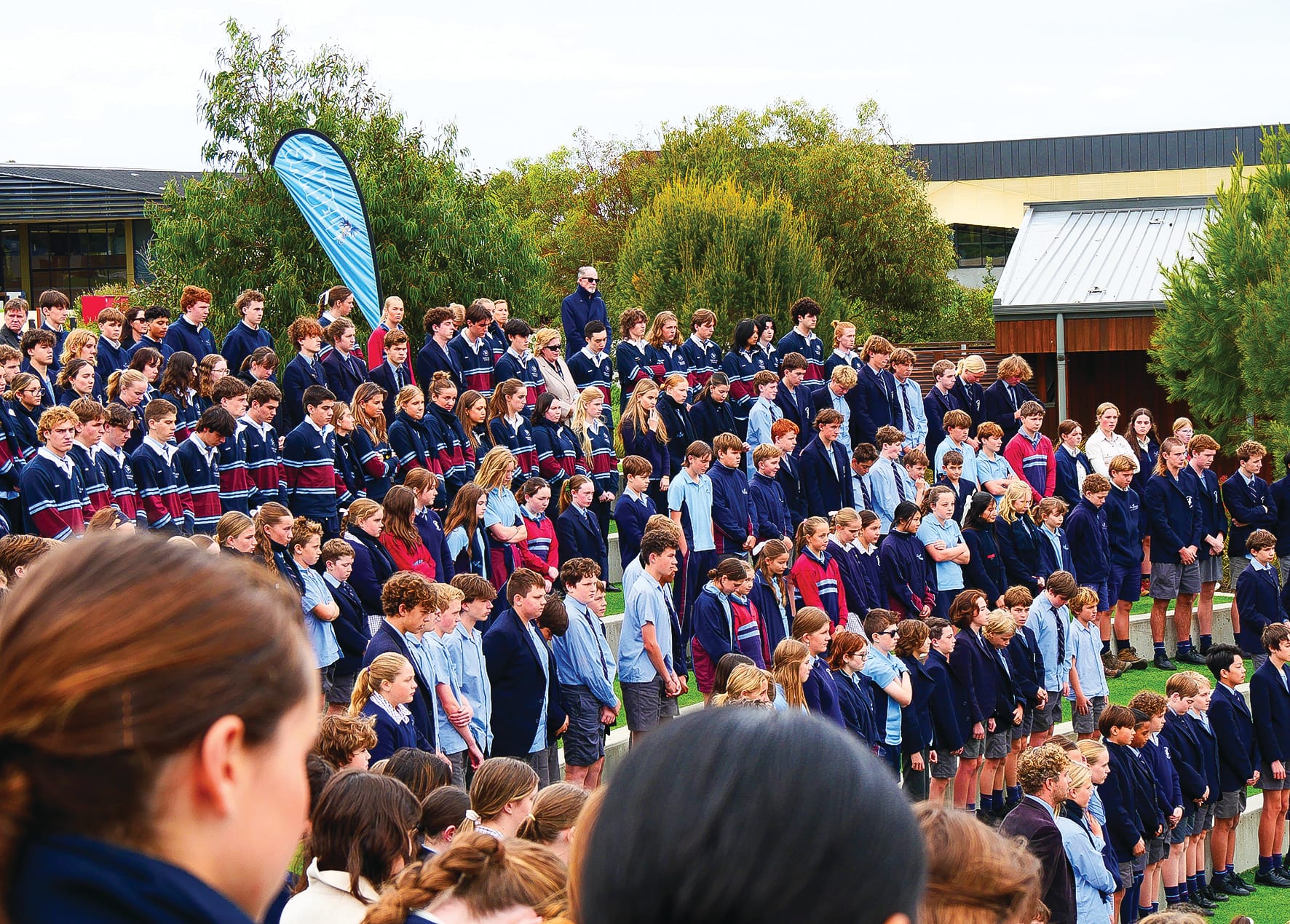 Proceedings were run by School Captain Max Arceo with fellow Captain Alice Mabilia sharing the speech she presented at San Remo on Anzac Day. The Combined College Choir sang the poem 'In Flanders Fields' by Craig Tibbitts as well as the New Zealand and Australian National Anthems. Year 9 student Keely Filsell and her music tutor Casey Thomsen played the Last Post on trumpet. The Junior School Captains laid a wreath at the Lone Pine as Year 9 students raised the flags. All students were reflective and respectful throughout the sombre occasion.