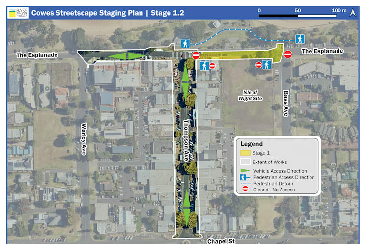 Stage 2.1 of Cowes Streetscape project is underway. This diagram shows the new pedestrian access between Thompson Avenue and Bass Avenue from now until December 21.