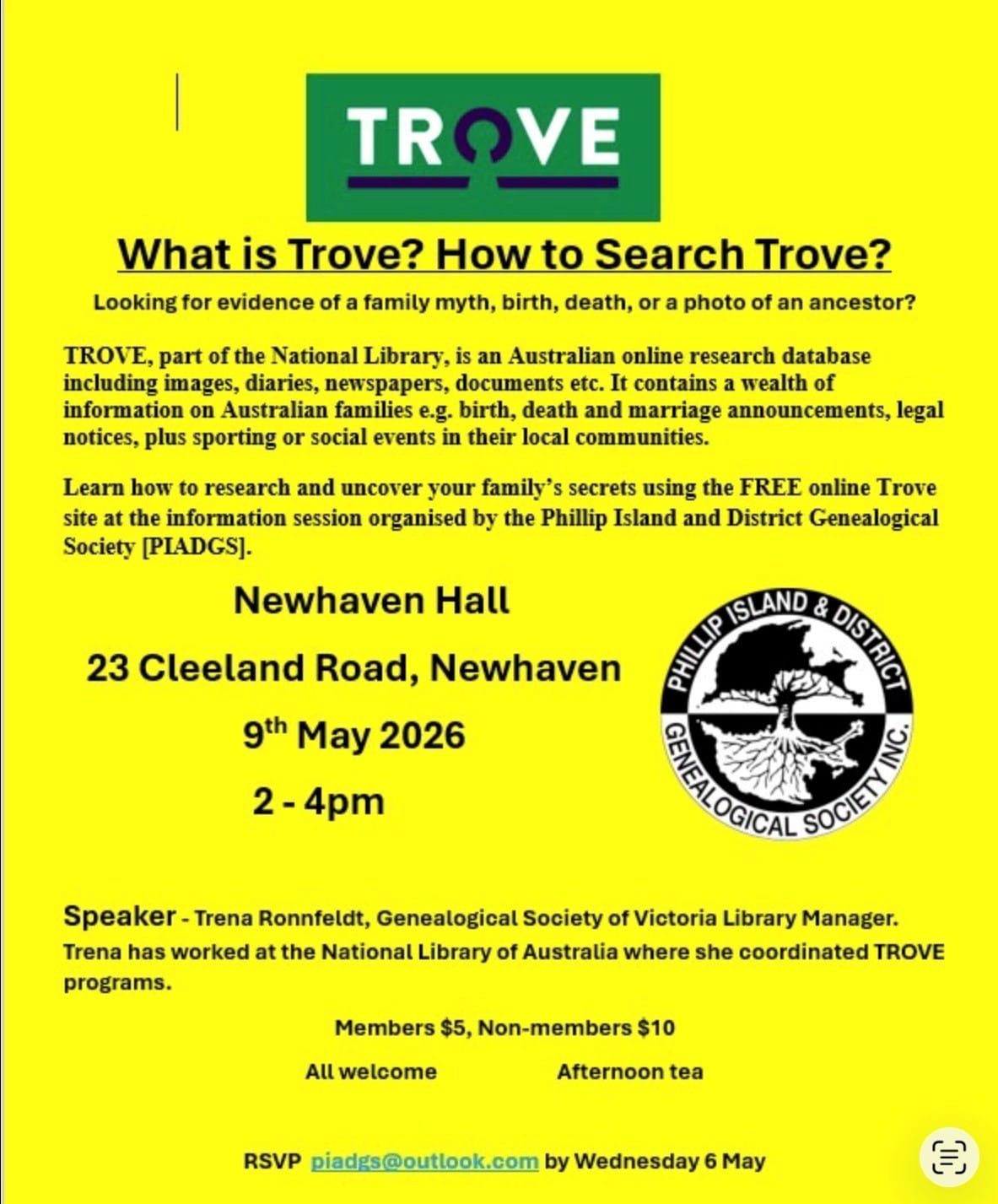 Guest speaker is Trena Ronnfeldt, Library Manager from the Genealogical Society of Victoria.