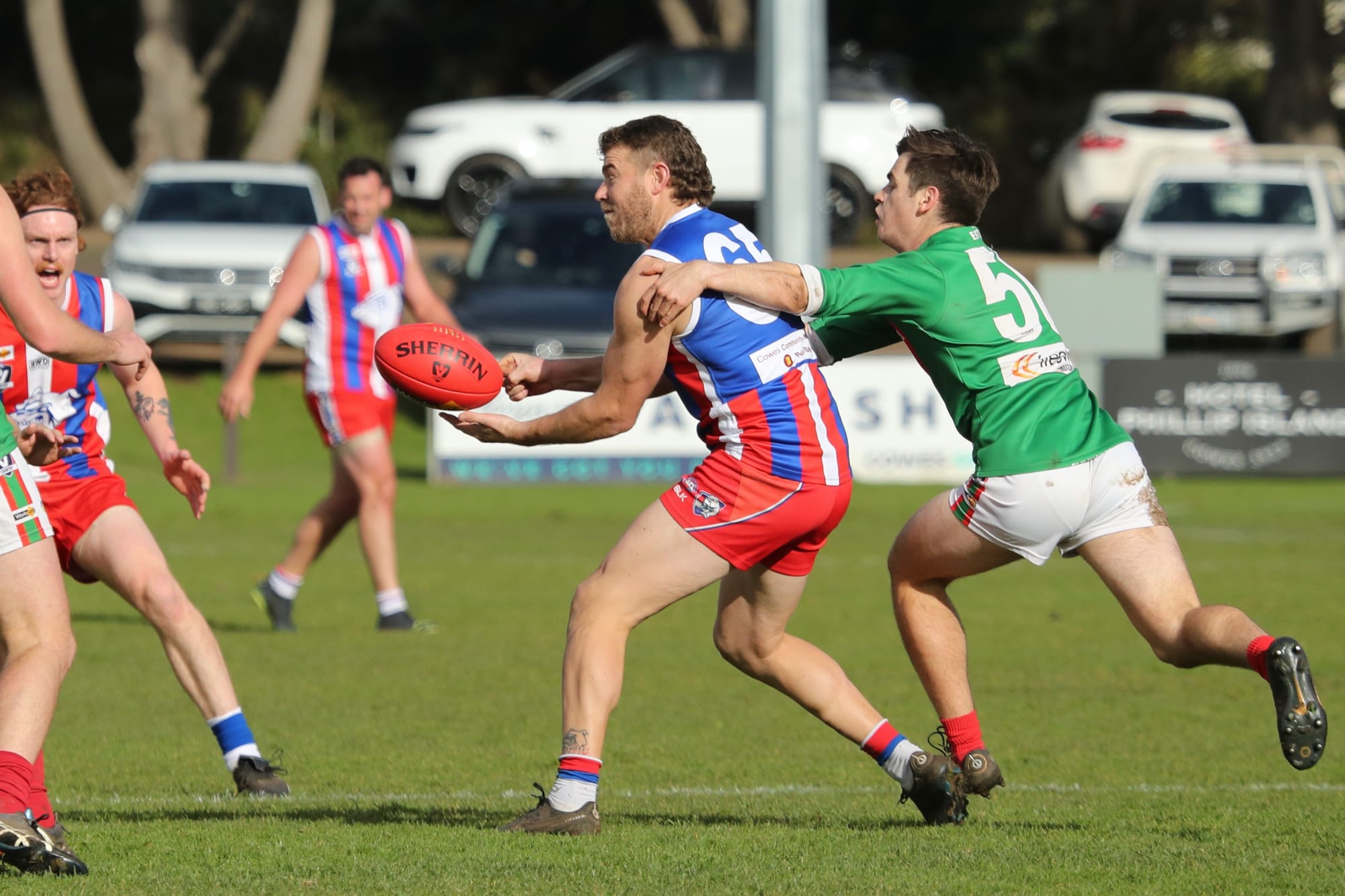 Scores: Phillip Island: 3.4.22, 4.8.32, 6.10.46, 7.11.53. Tooradin-Dalmore: 2.0.12, 3.4.22, 4.5.29, 6.8.44.