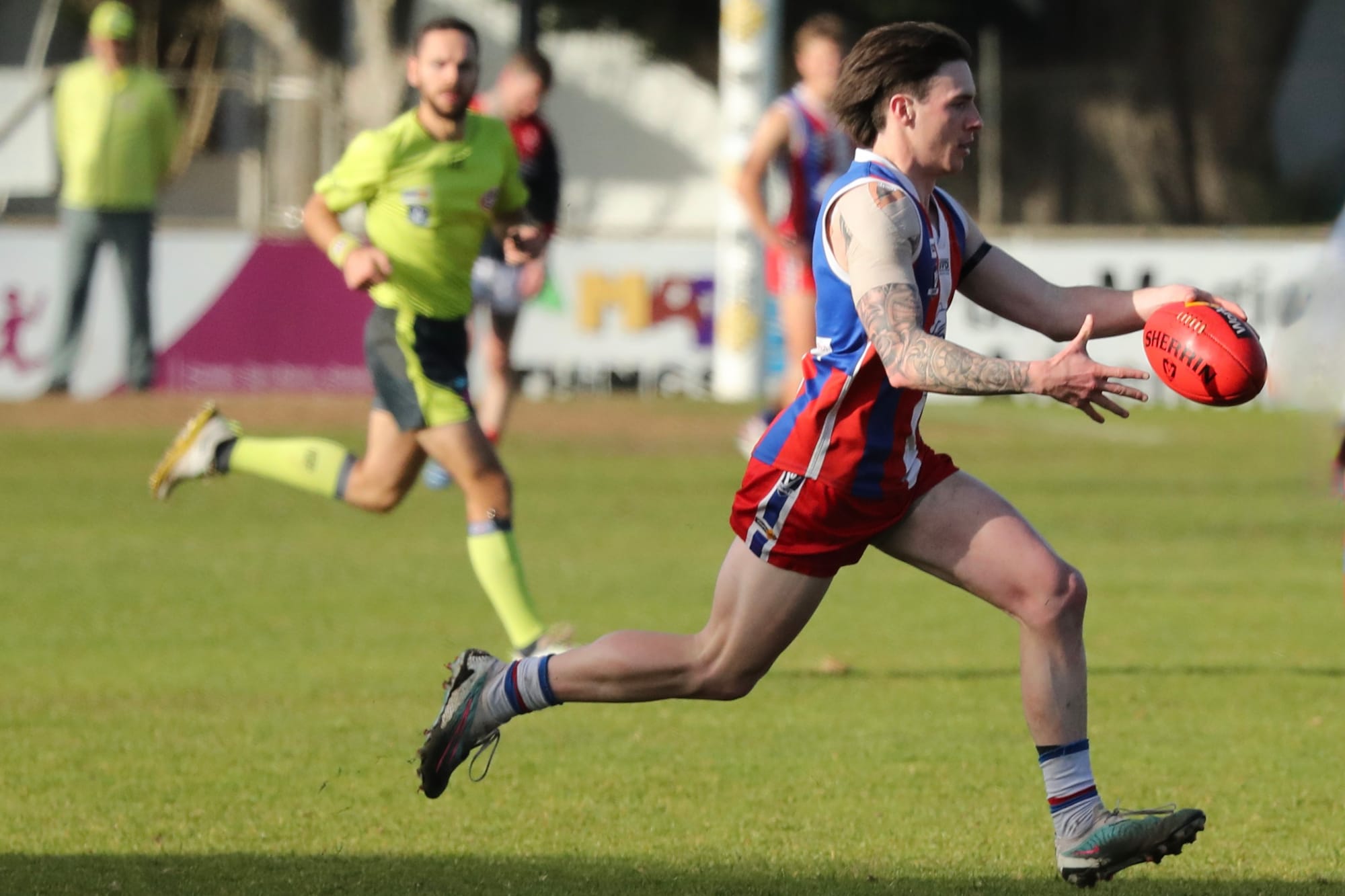 Bryce Hindhaugh showed his class on the wing combining with Jordy Patullo, providing much needed speed and delivery into the forward line, whilst the backline’s elder stateman Damien Holmes continued to lead the defensive efforts.
