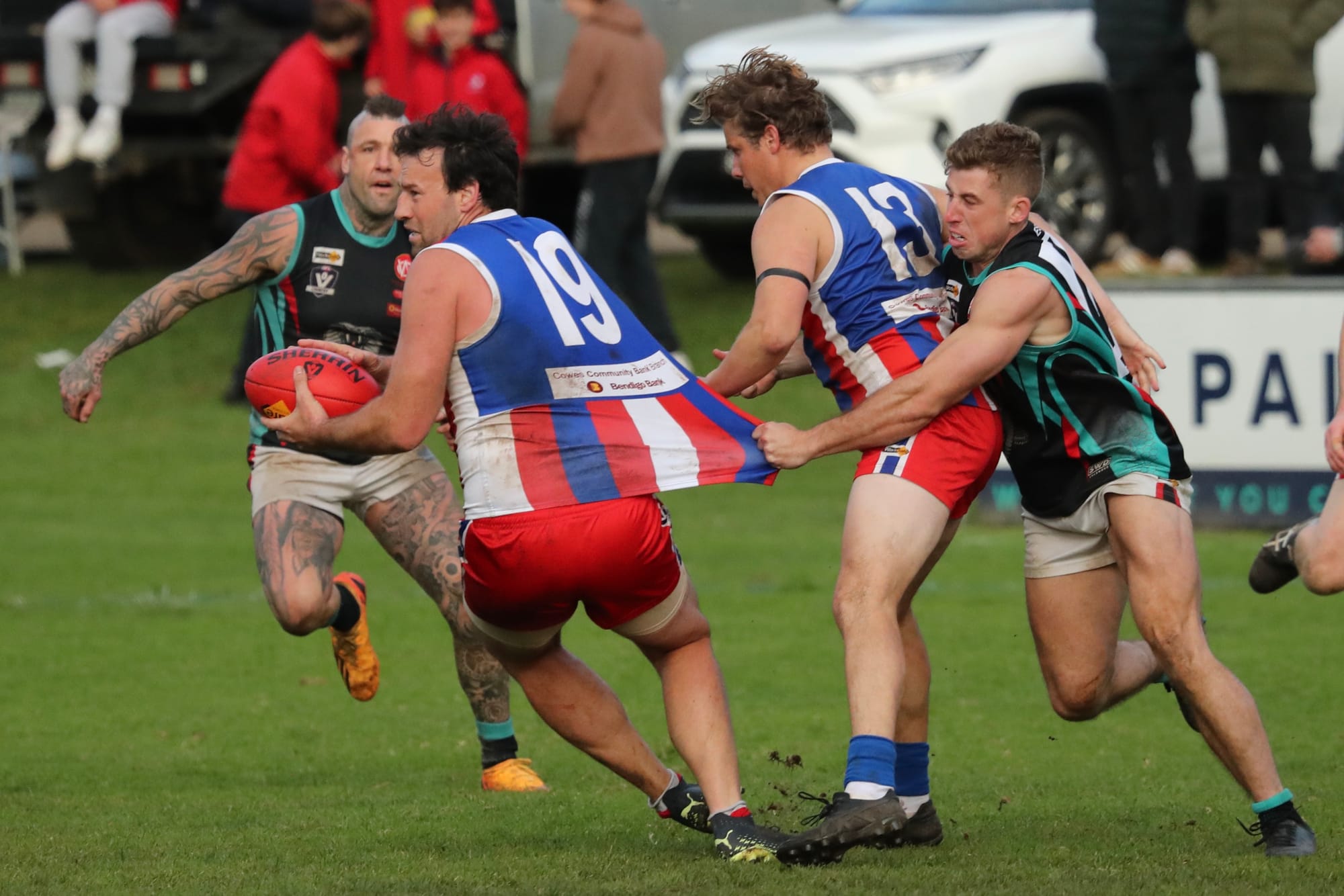 Cam Pedersen to the middle resulted in a clean clearance to a perfect lead and goal from Daniel Bourke, and momentum was back with the Dogs.