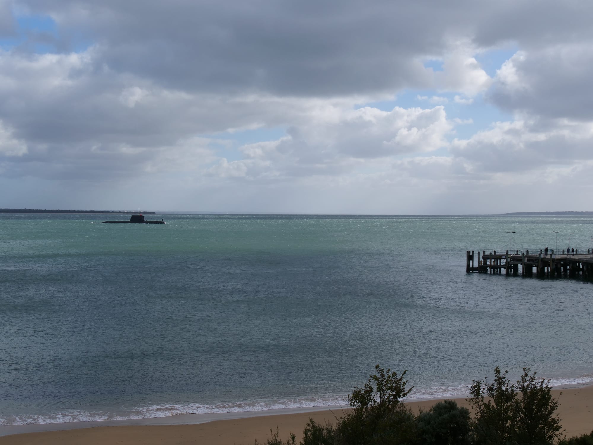 There was an unexpected visitor to Phillip Island when a submarine anchored just off the jetty in Cowes on Friday morning.