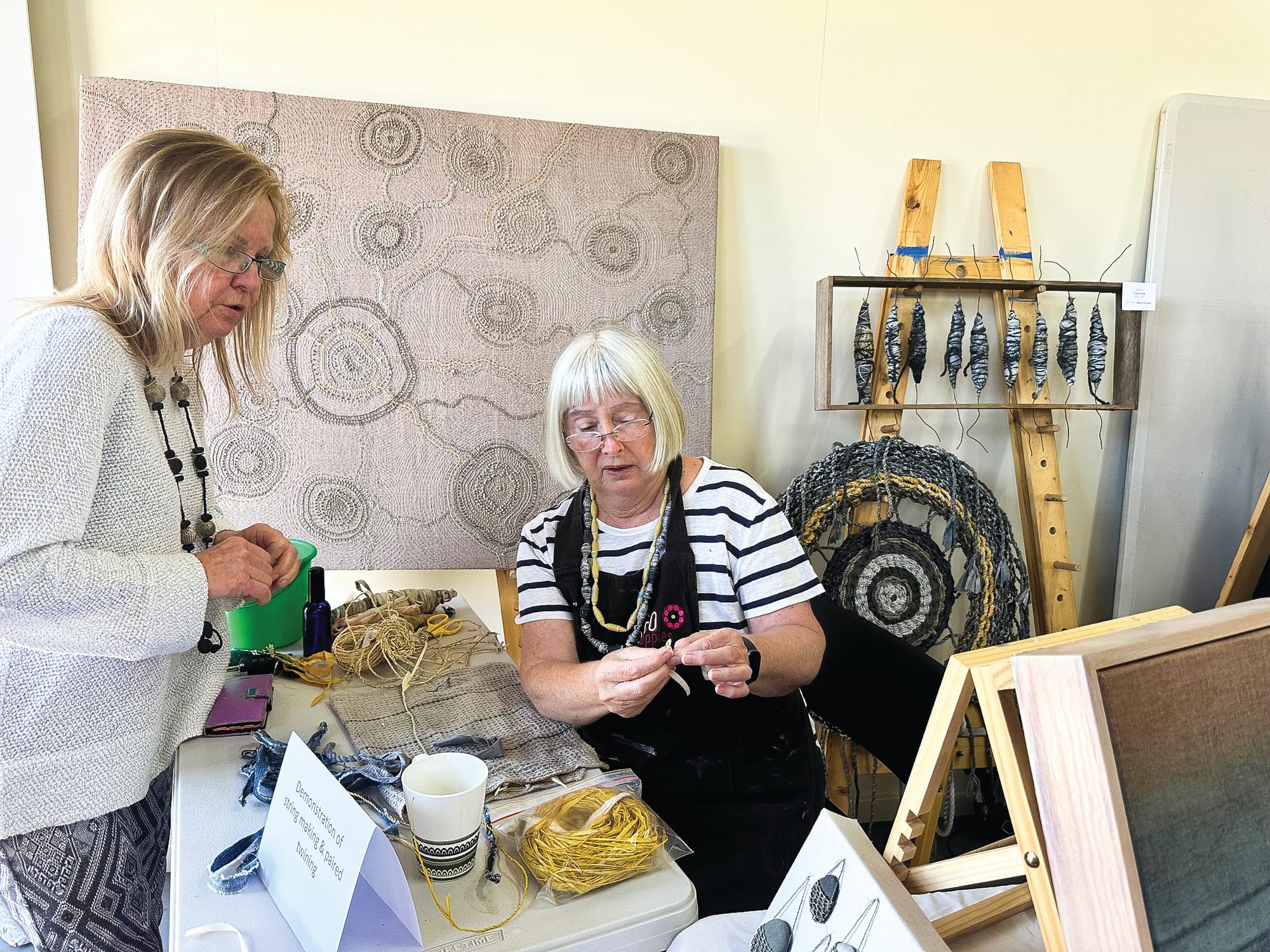 The art on display showcased weaving, felting, sewing, embroidery, spinning, lino cut, string making, and fabric basketry, with many items available to purchase.