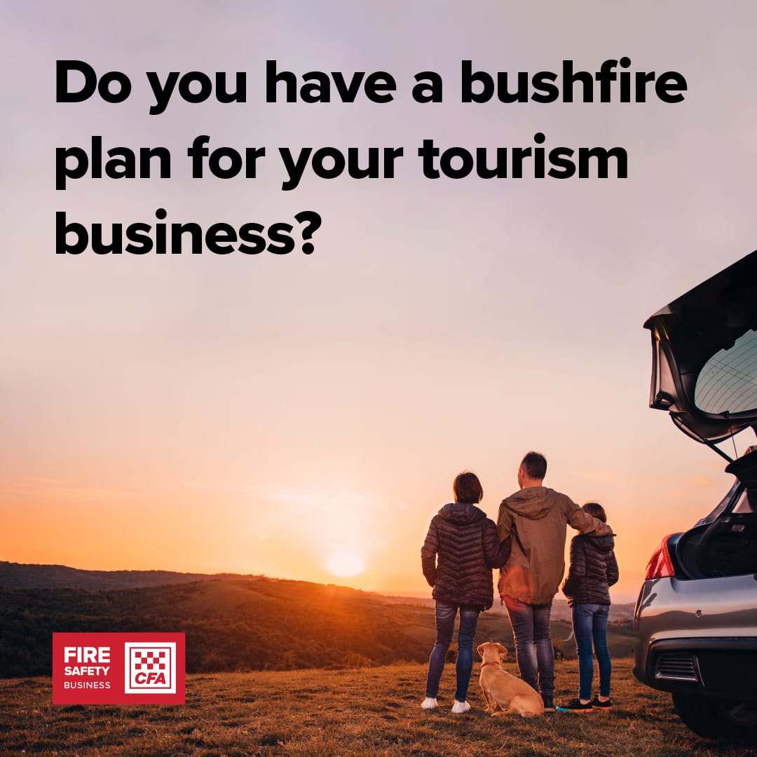 You can find the free Bushfire Planning for Tourism Businesses module and Tourism Business Bushfire Plan template on CFA’s website (www.cfa.vic.gov.au/tourism).