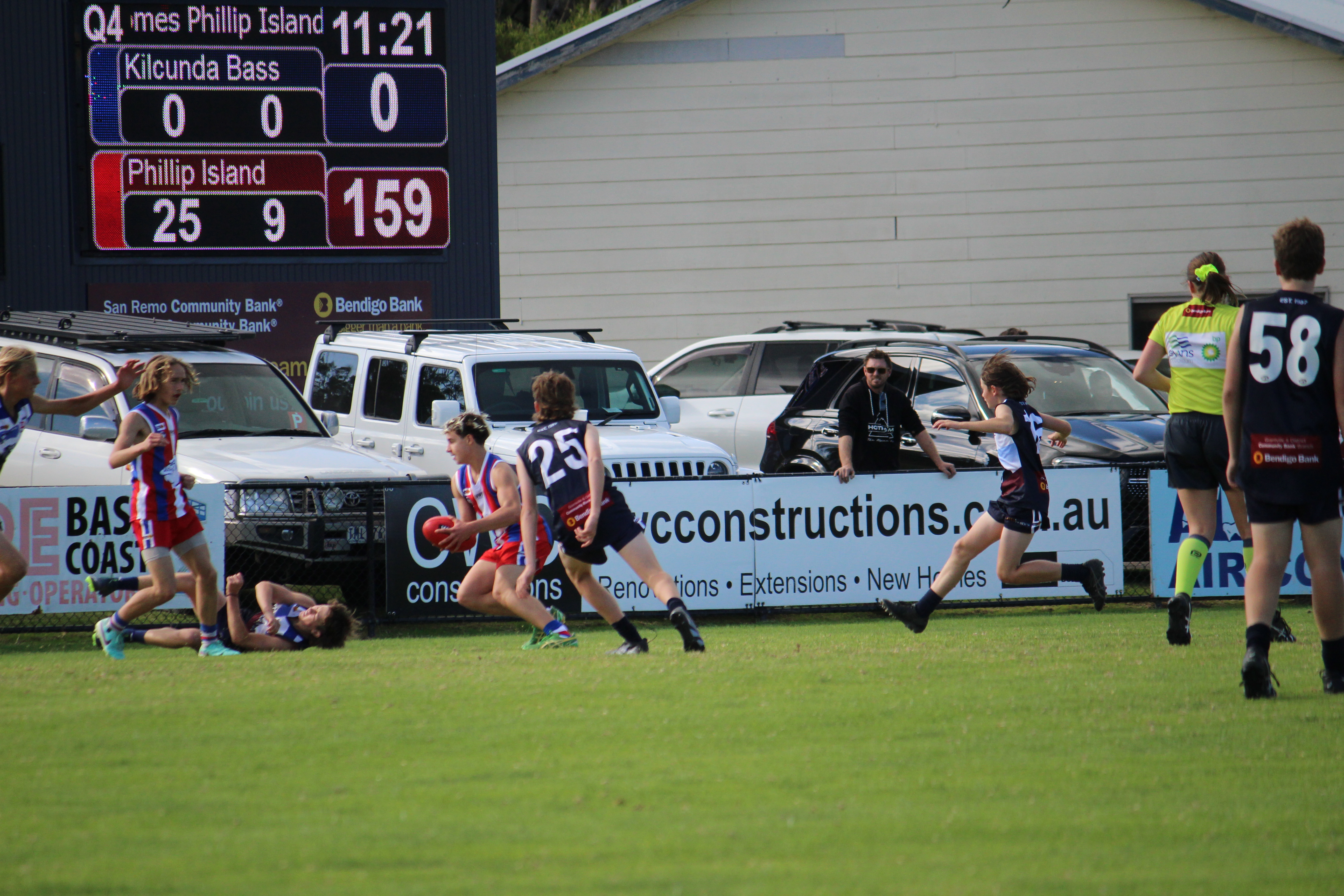 Scores: Phillip Island: 8.5.53, 13.7.85, 24.9.153, 27.14.176. Kilcunda Bass: 0.0.0, 0.0.0, 0.0.0, 0.0.0