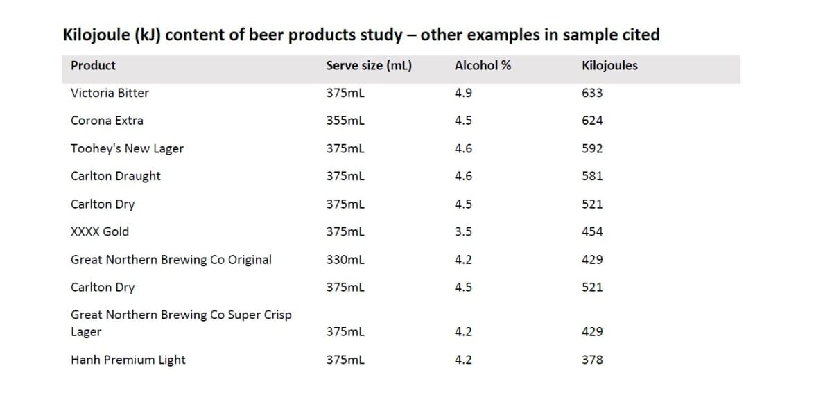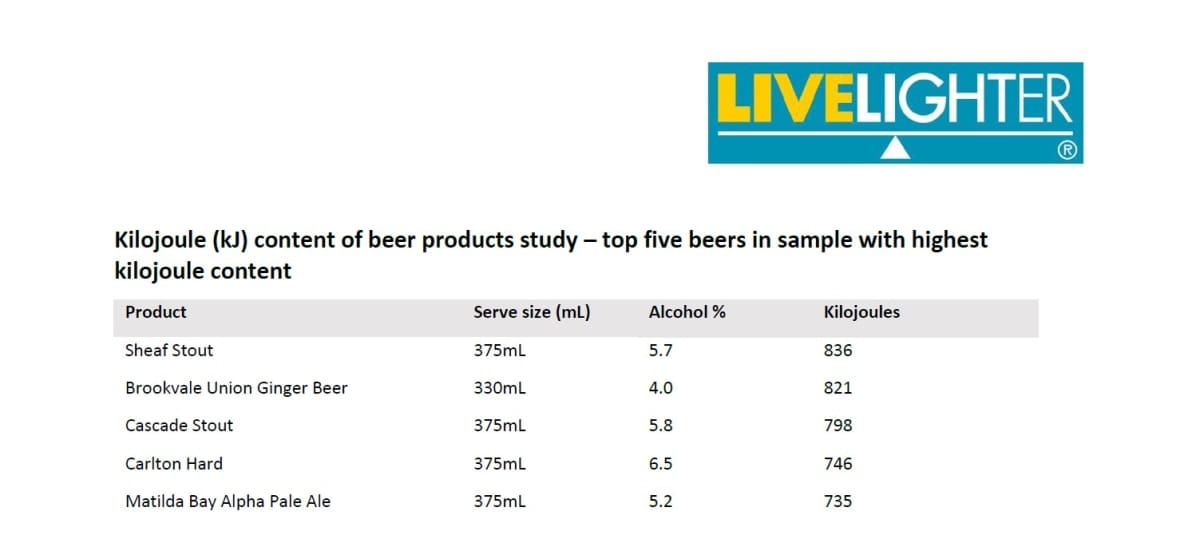 Comparing the kilojoule (kJ) content of 75 packaged beer products with select junk foods, the LiveLighter analysis found: