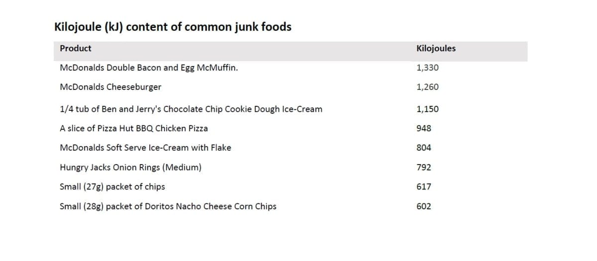 Fast food kJ content: