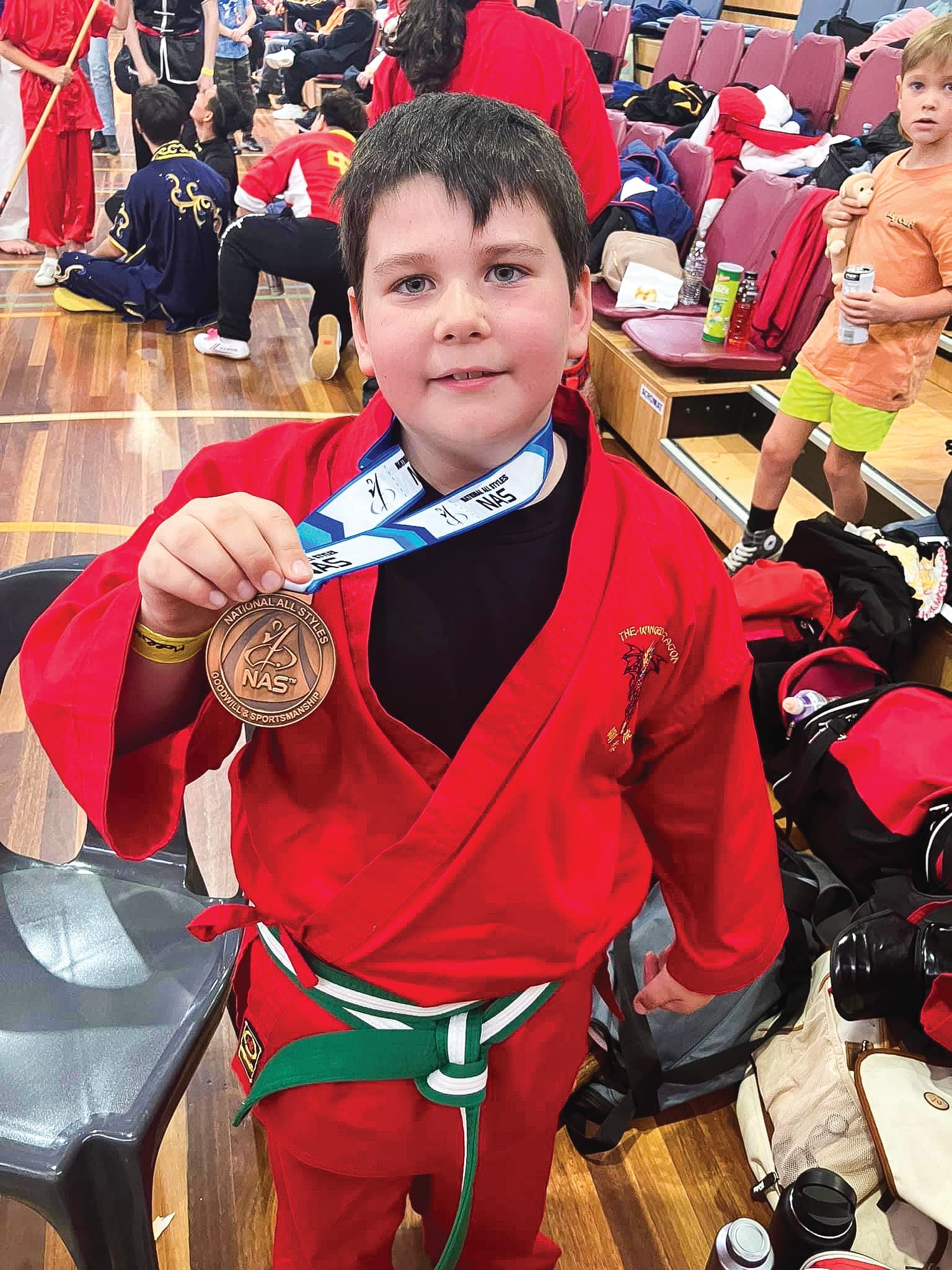 Morrison Conway and his teammate Lincoln Price (both who are seven years old) have been competing with the Winged Dragon team this year in the National All Styles Martial Arts Tournaments.